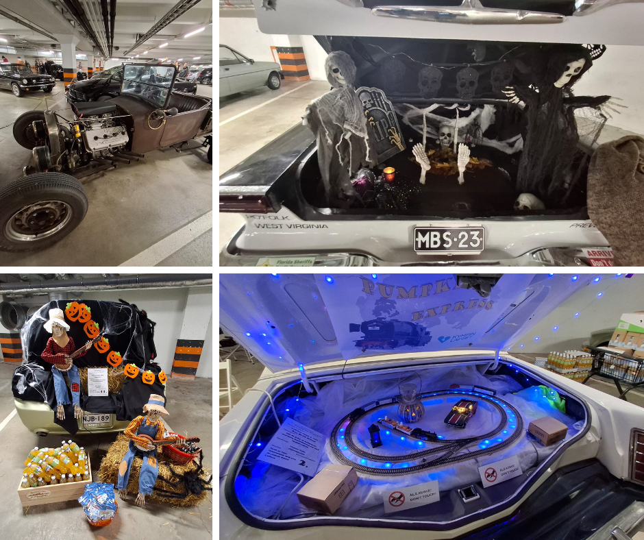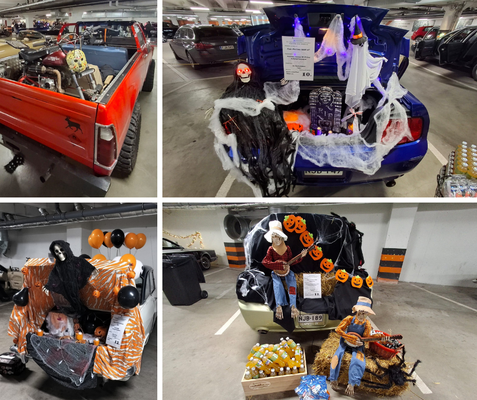 Parkkipaikalla nähtiin toinen toistaan luovemmin koristeltuja takakontteja, joista kurkisteli luurankoja, lepakoita, hämähäkkejä ja kurpitsoja. Jokaisella autolla oli oma tarinansa – osa koskettavia, osa hulvattomia.