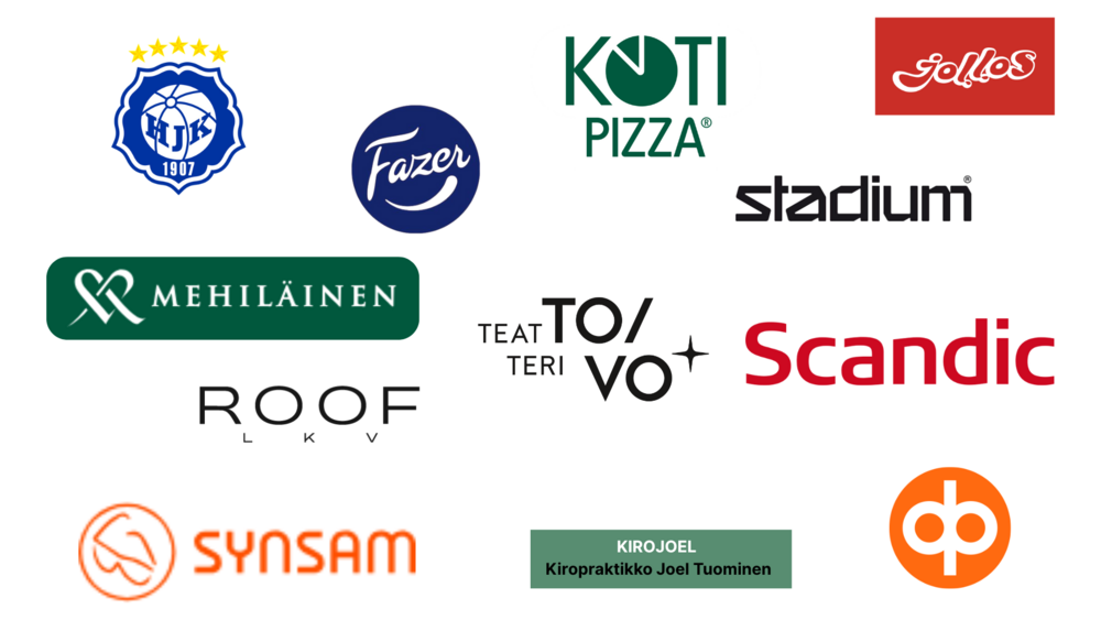 Synsam, Teatteri Toivo, Kirojoel, Kotipizza Oyj, Oy Karl Fazer Ab, Mehiläinen, Scandic, Helsinki Rock and Roll, Adidas, Stadium, Potential Foods, Roof LKV, OP uusimaa, FAIS Finland, HJK