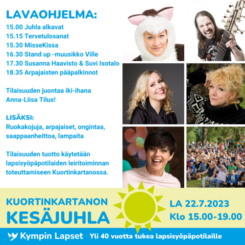 Vietä kesäpäivää koko perheen voimin Kuortinkartanon kesäjuhlassa! Nauti upeasta lavaohjelmasta ja osallistu arpajaisiin, joissa voit voittaa huikean hienoja palkintoja. Juhlan juontaa jälleen iki-ihana Anna-Liisa Tilus ja tänä vuonna juhlassa esiintyvät upeat artistit Susanna Haavisto ja Suvi Isotalo, Stand up -muusikko Ville Saarenketo ja lastentaiteilija MisseKissa.